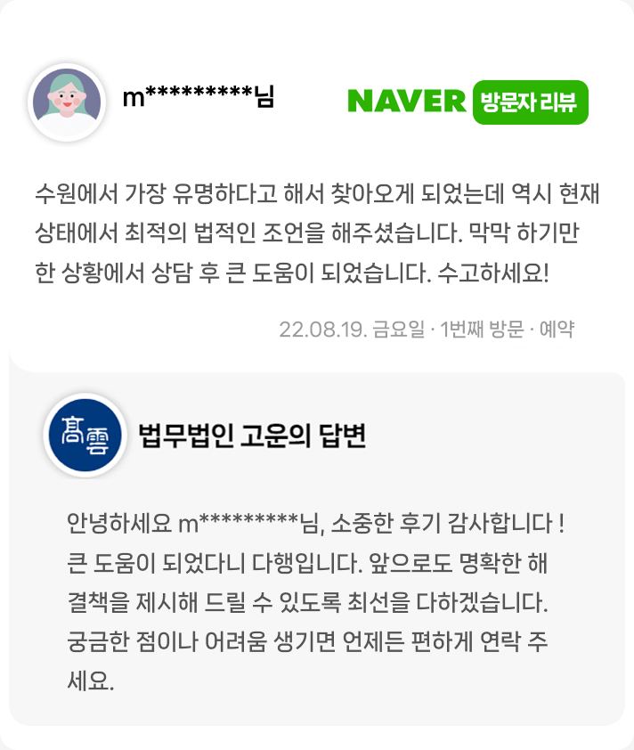 현재 상태에서 최적의 법적인 조언을 해주셨습니다. 막막 하기만 한 상황에서 상담 후 큰 도움이 되었습니다.