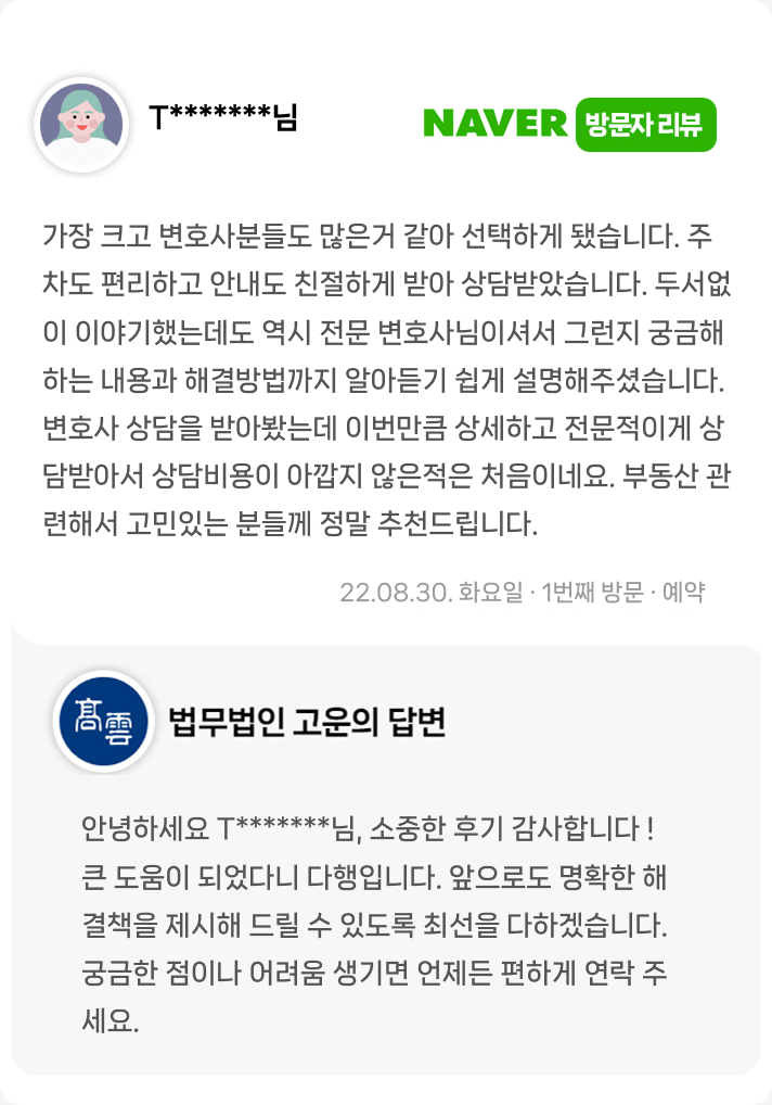전문적이게 상담받아서 상담비용이 아깝지 않은적은 처음이네요. 부동산 관련해서 고민있는 분들께 추천드립니다.