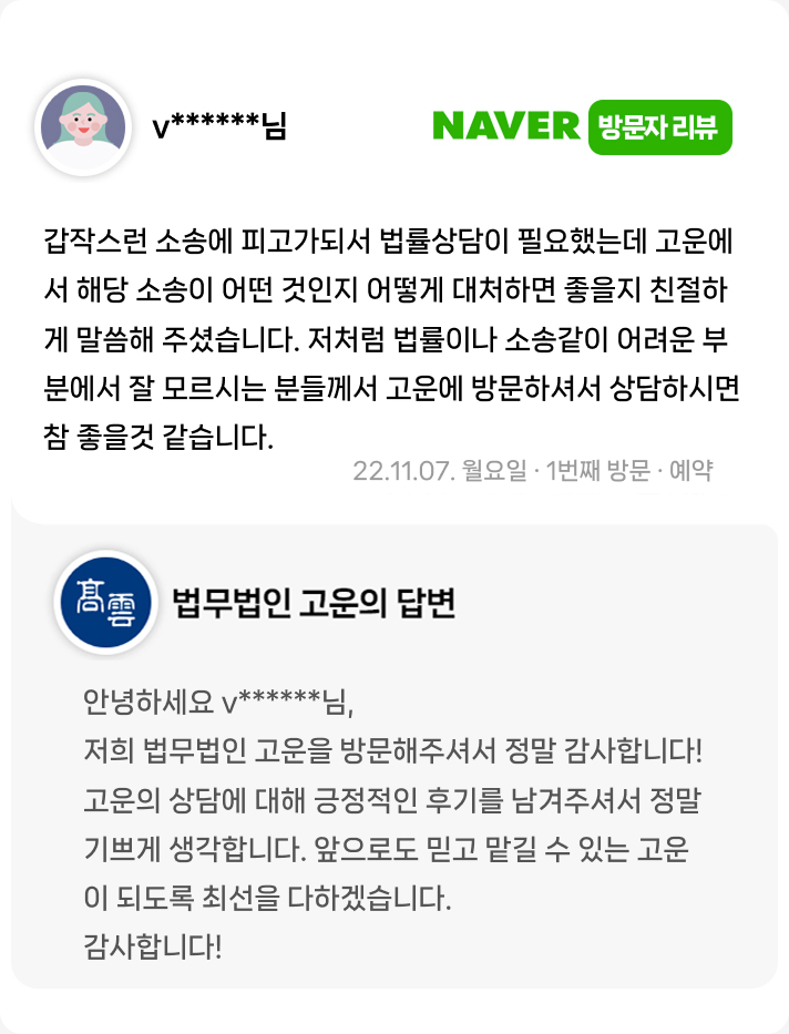 법률이나 소송같이 어려운 부분에서 잘 모르시는 분들께서 고운에 방문하셔서 상담하시면 참 좋을것 같습니다.