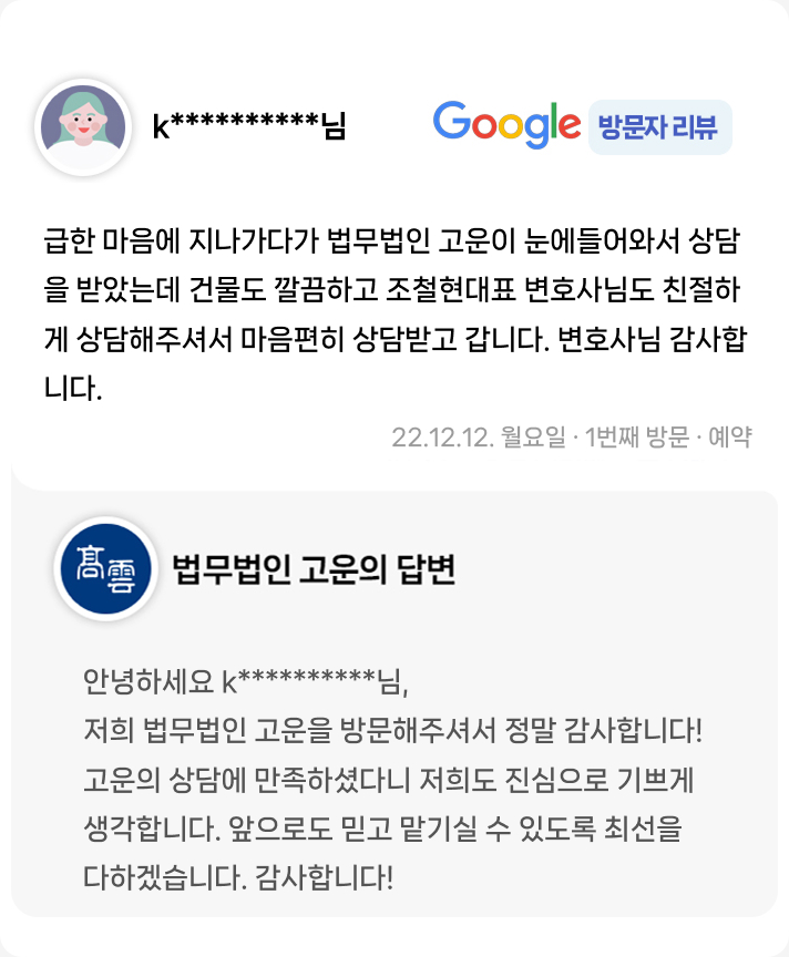 조철현대표 변호사님도 친절하게 상담해주셔서 마음편히 상담받고 갑니다.