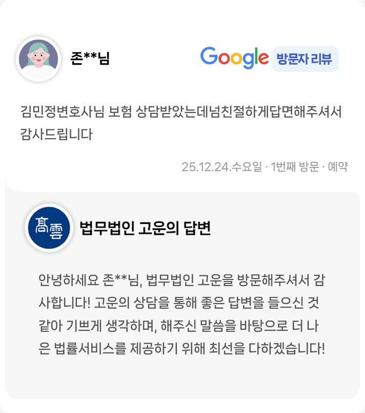 김민정변호사님 보험 상담받았는데 넘 친절하게 답면해주셔서감사드립니다.