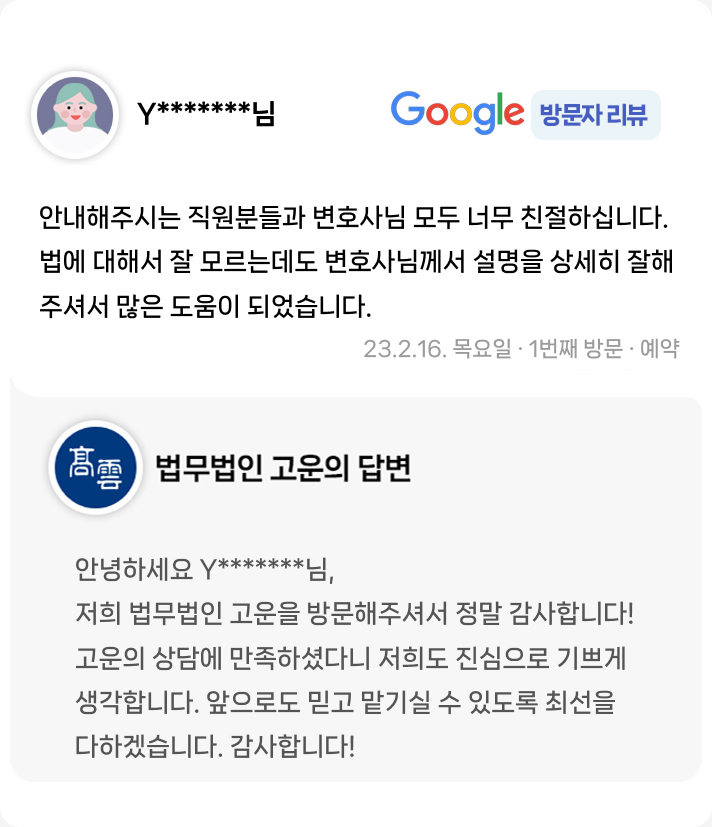 법에 대해서 잘 모르는데도 변호사님께서 설명을 상세히 잘해주셔서 많은 도움이 되었습니다.