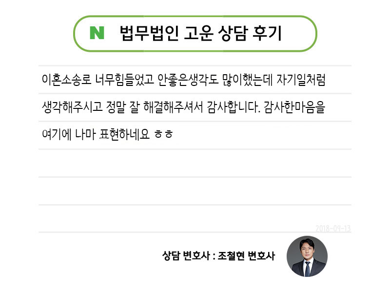 이혼소송로 너무힘들었고 안좋은생각도 많이했는데 자기일처럼 생각해주시고 정말 잘 해결해주셔서 감사합니다.