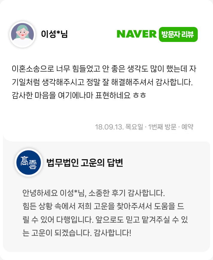 이혼소송으로 너무 힘들었고 안 좋은생각도 많이 했는데 자기일처럼 생각해주시고 정말 잘 해결해주셔서 감사합니다.