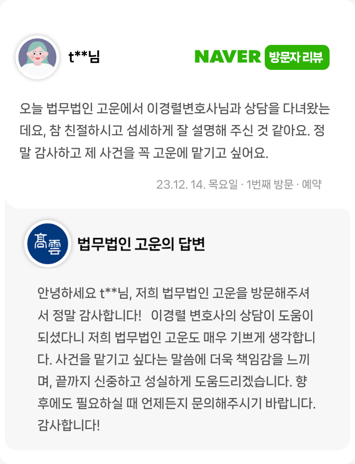 참 친절하시고 섬세하게 잘 설명해 주신 것 같아요. 정말 감사하고 제 사건을 꼭 고운에 맡기고 싶어요.