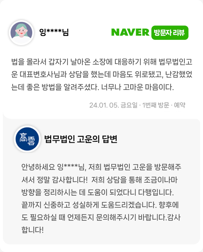 법을 몰라서 갑자기 날아온 소장에 대응하기 위해 상담을 했는데 마음도 위로됐고, 좋은 방법을 알려주셨다.