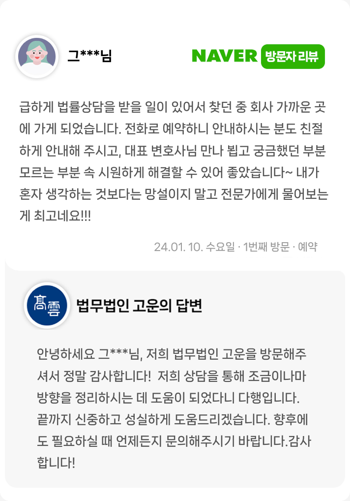대표 변호사님 만나 뵙고 궁금했던 부분 모르는 부분 속 시원하게 해결할 수 있어 좋았습니다.