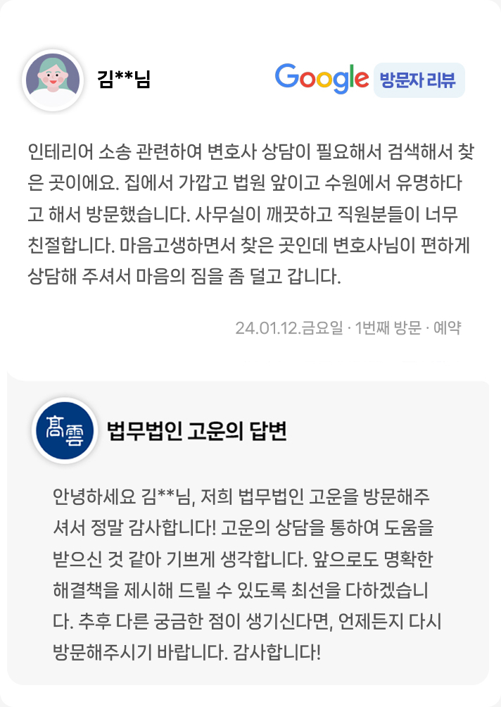 마음고생하면서 찾은 곳인데 변호사님이 편하게 상담해 주셔서 마음의 짐을 좀 덜고 갑니다.