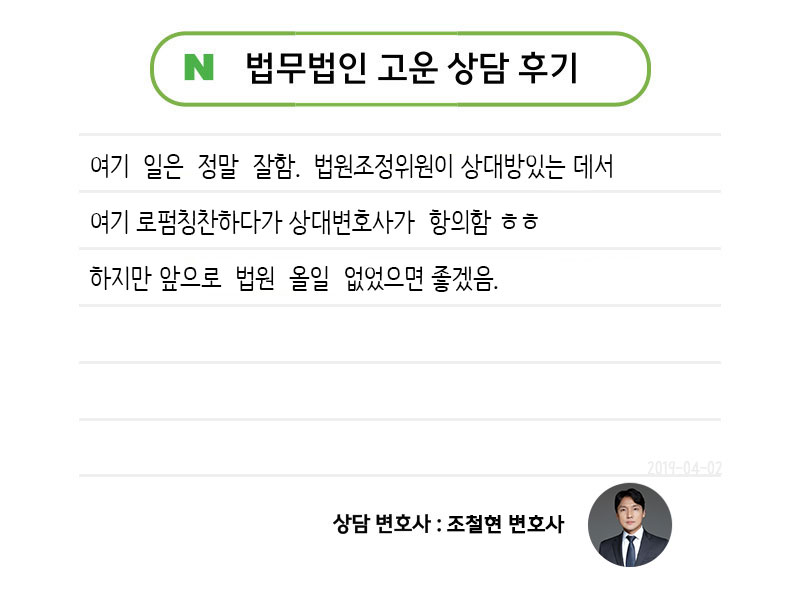 여기 일은 정말 잘함. 법원조정위원이 상대방있는 데서 여기 로펌칭찬하다가 상대변호사가 항의함 ㅎㅎ 하지만 앞으로 법원 올일 없었으면 좋겠음.