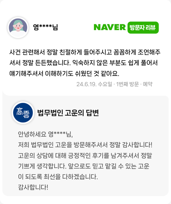 사건 관련해서 정말 친절하게 들어주시고 꼼꼼하게 조언해주셔서 정말 든든했습니다.