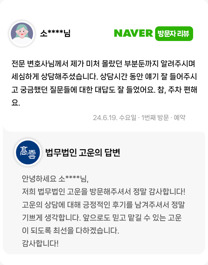 전문 변호사님께서 제가 미처 몰랐던 부분둔까지 알려주시며 세심하게 상담해주셨습니다.