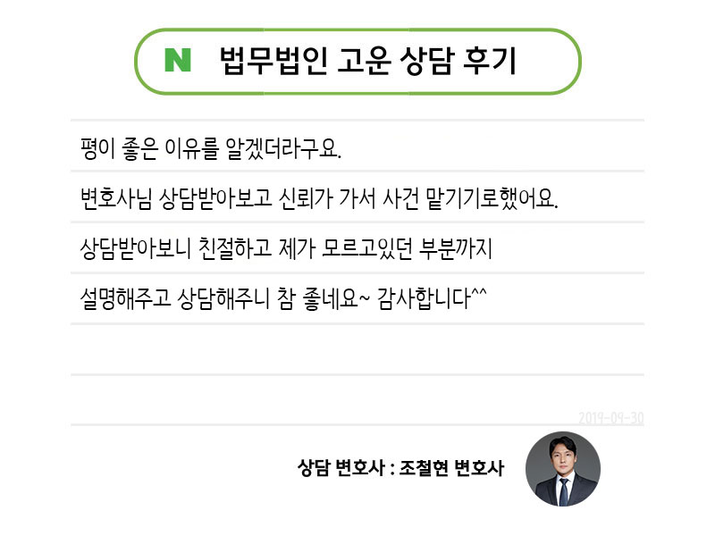 평이 좋은 이유를 알겠더라구요. 변호사님 상담받아보고 신뢰가 가서 사건 맡기기로했어요. 상담받아보니 친절하고 제가 모르고있던 부분까지 설명해주고 상담해주니 참 좋네요~감사합니다^^