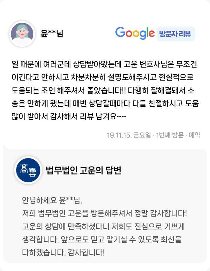 여러군데 상담받아봤는데 고운 변호사님은 무조건 이긴다고 안하시고 차분히 설명도해주시고 현실적으로 도움되는 조언 해주셔서 좋았습니다.