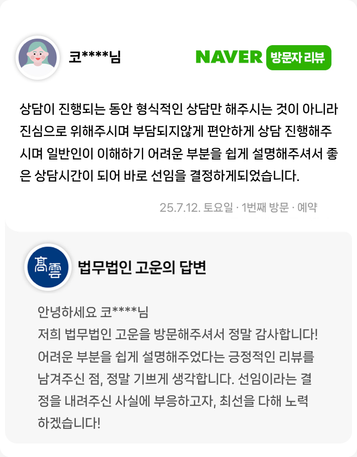 어려운 부분을 쉽게 설명해주셔서 좋은 상담시간이 되어 바로 선임을 결정하게되었습니다.