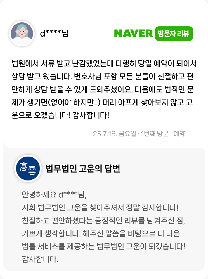 변호사님 포함 모든 분들이 친절하고 편안하게 상담 받을 수 있게 도와주셨어요.