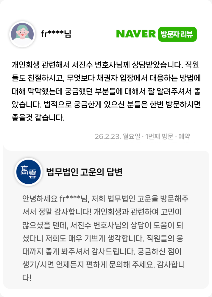 무엇보다 채권자 입장에서 대응하는 방법에 대해 막막했는데 궁금했던 부분들에 대해서 잘 알려주셔서 좋았습니다.