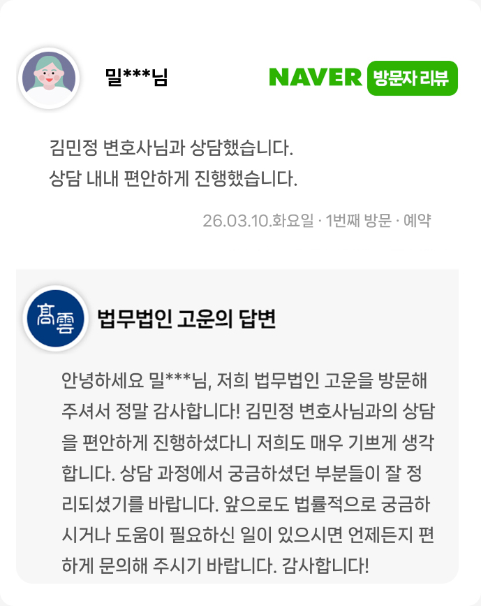 김민정 변호사님과 상담했습니다. 상담 내내 편안하게 진행했습니다.
