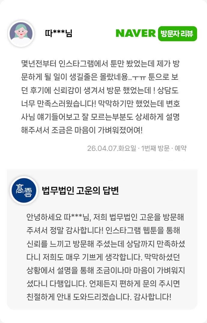 막막하기만 했었는데 변호사님 얘기들어보고 잘 모르는부분도 상세하게 설명해주셔서 조금은 마음이 가벼워졌어여!