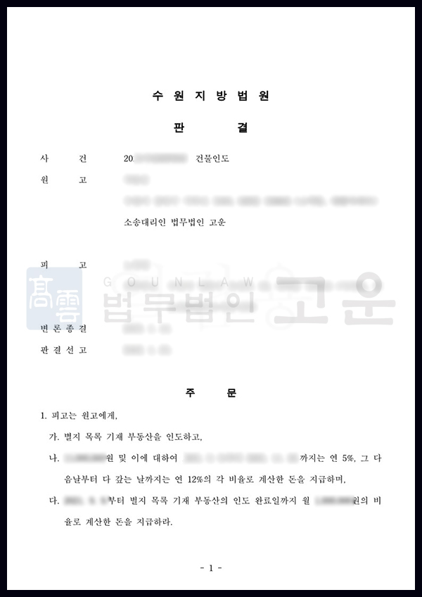 의뢰인 A는 임차인 B가 임대료를 연체한 채 건물 인도를 거부하자 법무법인 고운에 사건을 의뢰하였고, 고운은 미지급 임대료와 불법 점유로 인한 손해를 증거로 입증하는 한편 재산 은닉을 막기 위해 가압류를 신청하였습니다. 그 결과 재판부는 부동산 인도, 연체 임대료 및 지연손해금 지급, 인도 지연 시 추가 임대료 지급을 명하는 판결을 내렸습니다.