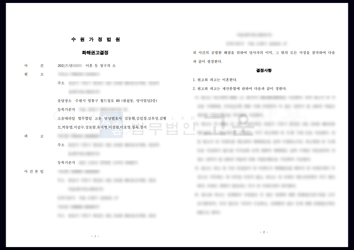 그 결과 법원에서는 고운이 작성한 합의서의 내용대로 이혼한다는 내용의 화해권고결정을 내렸고, B씨 역시 결정에 대해 이의나 불복하지 않아 A씨는 무사히 이혼을 할 수 있게 되었습니다. 바람대로 갈등 없이 신속하게 이혼절차를 마무리하게 된 의뢰인은 결과에 크게 만족하였습니다.