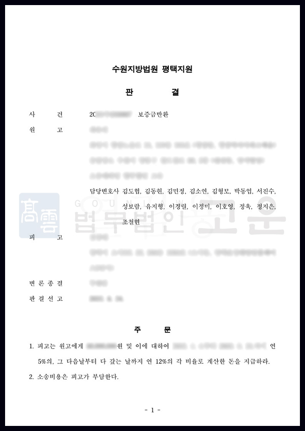 재판부는 법무법인 고운의 주장을 받아들여 B로 하여금 보증금을 반환할 것은 물론, 지급이 늦어진 만큼의 지연이자를 지급하라고 판결하였습니다. 또한 가압류 신청도 받아들여 B가 멋대로 부동산을 증여하거나 처분하지 못하도록 막는데 성공하였습니다.