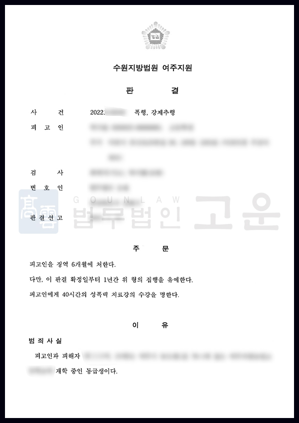 피해자 A는 같은 학교 학생 B로부터 반복적인 신체접촉과 폭행을 동반한 성추행을 당해 학교폭력으로 신고했으나 학폭위에서 A에게도 징계가 내려지자 법무법인 고운은 A의 징계처분 취소 및 재심을 청구하고 형사 고소를 진행하며 진단서·탄원서 등으로 피해 사실을 입증해 결국 A의 징계는 모두 취소되고 B에게는 징역형 집행유예가 선고되었습니다.