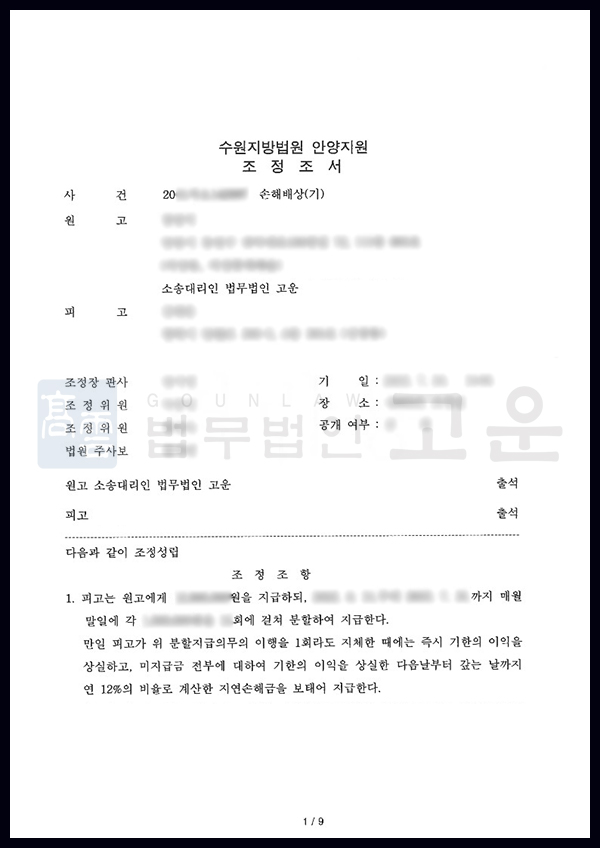 의뢰인 A는 교통사고로 차량이 파손됐으나 상대방 B가 높은 수리비를 이유로 보상을 거부하자 법무법인 고운은 블랙박스·CCTV 분석을 통해 B의 급차선변경과 주의의무 위반을 입증하고 손해액을 산정해 제출하여 결국 B의 책임을 인정받고 A가 손해배상금을 지급받는 판결을 얻었습니다.