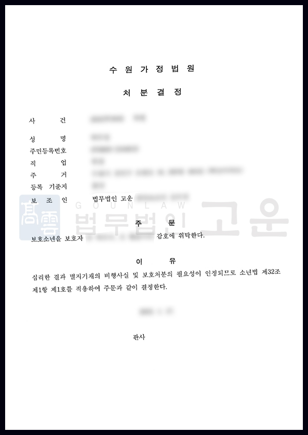 그 결과 법무법인 고운의 주장을 받아들여 보호자 감호 위탁(1호 처분)이라는 가벼운 처분을 받았습니다.