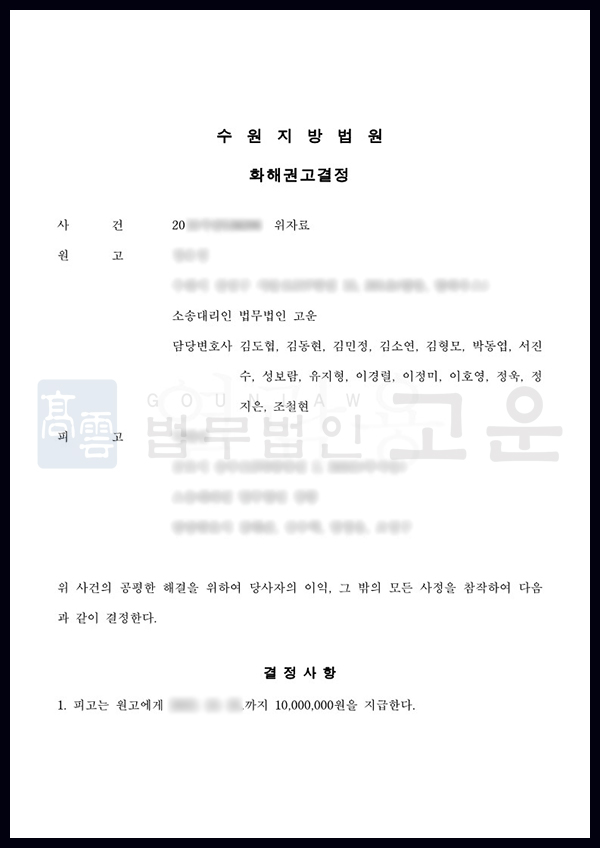 다. 이에 법무법인 고운은 C로부터 C의 잘못에 상응하는 손해배상금을 받되, 다만 A의 의사가 아직은 가정을 지키는 것이 우선이었으므로, 향후 C가 다시 B와 부적절한 만남을 할 경우 그 위반행위 1회 당 손해배상금을 추가로 지급받을 수 있도록 하는 내용으로 화해권고결정을 받을 수 있도록 재판을 진행하였습니다.