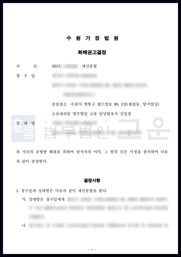 법무법인 고운은 B씨와의 합의안에 따라 신속히 화해권고결정을 구하는 신청을 하였고, 합의서의 내용대로 A씨가 재산분할을 받을 수 있는 내용의 결정이 내려졌고, 당초 A씨가 청구한 이상의 재산분할금액을 받을 수 있게 되었습니다. 제척기간이 도과할 경우 재산분할 청구 자체가 불가능해 질 수 있는 상황에서 신속한 대처로 정당한 권리를 지켜낼 수 있었고, 이러한 소송 절차에 대해 A씨는 크게 만족하였습니다.