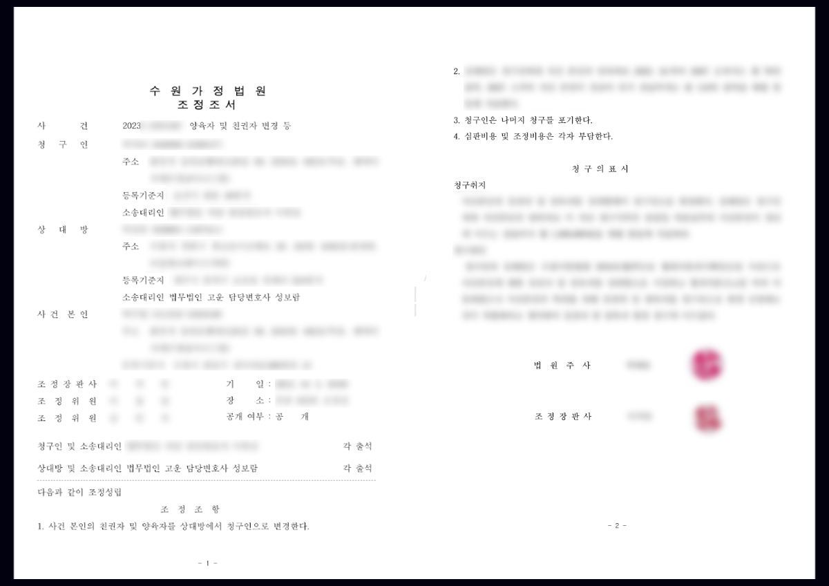 A씨는 협의이혼 후 자녀를 양육하다가 이후 협의로 B씨가 자녀를 양육하게 되었고, B씨가 친권·양육자 변경과 함께 과도한 양육비를 청구하자 법무법인 고운에 의뢰했습니다. 고운은 이혼 당시 양육비를 서로 청구하지 않기로 합의했고 실제로 지급·수령한 적도 없으며, A씨의 소득이 적고 불규칙해 감당 가능한 수준으로 산정돼야 한다고 주장했습니다. 그 결과 조정으로 B씨 청구액에서 60% 감액된 양육비로 확정되었습니다.