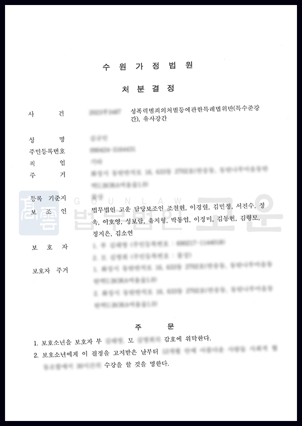 보호소년 A는 친구들의 강요로 피해자 B의 신체를 만졌고, 이후 B가 A만 성추행으로 신고해 처벌 위기에 놓였습니다. 고운은 A의 행위가 친구들의 강요에 따른 것이고, 반성 및 보호자 지도 의지와 피해 회복 노력이 있다는 점을 적극 주장했습니다. 그 결과 재판부는 1·3·5호 보호처분만 내려 비교적 경미한 처분으로 사건이 마무리되었습니다.