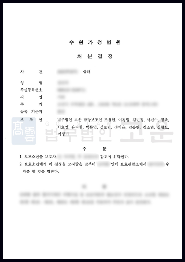 미성년자 A는 후배 B의 시비로 다툼 끝에 폭행해 상해죄로 고소당했고, 과거 보호처분 전력이 있어 중한 처분이나 형사처벌까지 우려되는 상황이었습니다. 고운은 사건이 형사재판이 아닌 소년재판으로 진행되도록 조력하고, A의 반성·협조, 피해 회복 노력, 부모의 훈육 의지 등을 적극 소명했습니다. 그 결과 1호 감호위탁과 2호 수강명령의 비교적 낮은 처분으로 마무리되었습니다.