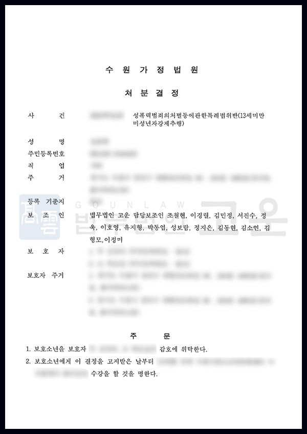 미성년자 A는 초등학생에게 부적절한 성적 언행과 신체접촉을 해 신고되어, 증거가 명확한 만큼 중한 처분이 우려되는 상황이었습니다. 법무법인 고운은 A가 사실관계를 인정하고 반성하며 조사에 성실히 임했고, 피해 회복을 위해 사과와 조치를 취한 점 등을 강조해 소년재판에서 최대한 선처를 받을 수 있도록 조력했습니다. 그 결과 재판부는 1호 감호위탁과 2호 수강명령 처분으로 사건이 마무리되었습니다.