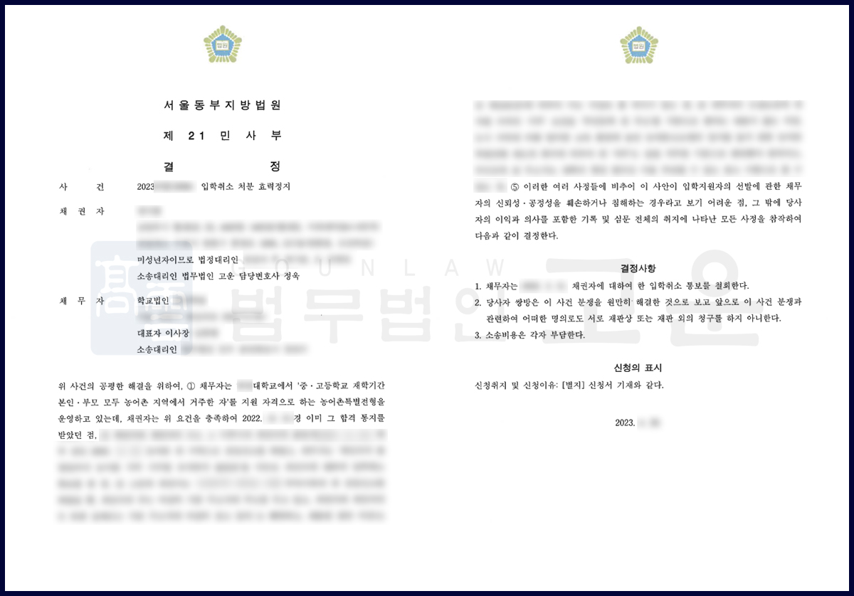 재판부는 법무법인 고운의 주장을 받아들여, A씨가 농어촌특별기회 전형을 악용하여 입학의 신뢰성, 공정성을 훼손하기로 보기 어렵다고 판단하고, 당사자들에게 화해권고결정을 내렸습니다. 이후 법무법인 고운은 B대학교측과 협의하여, 서로 화해권고결정에 이의하지 않기로 하였고, 결국 B대학교의 입학취소처분을 철회될 수 있었습니다.