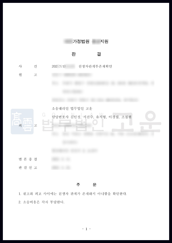결국 A씨와 C씨 사이에 친생자 관계가 존재하지 않는 것이 확인된다는 판결이 내려졌고, A씨는 가족관계등록부상의 잘못된 친생자 관계를 바로잡을 수 있게 되었습니다. 또한 해당 결과를 바탕으로 부당하게 양육비를 수령한 B씨를 상대로 소송을 진행할 수 있게 되어, A씨는 법무법인 고운의 신속하고 정확한 사건 진행에 대해 매우 만족하였습니다.