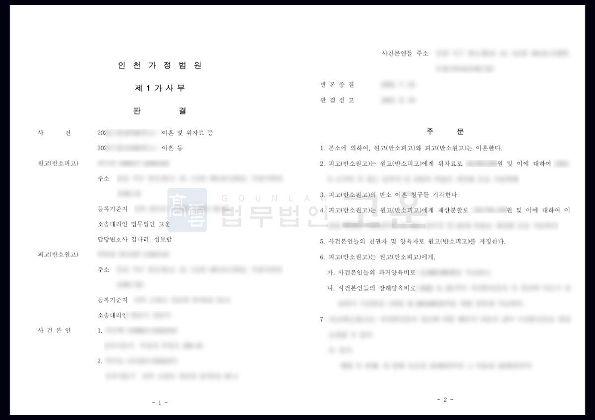 결국 법원은 B씨의 반소 이혼 청구를 기각한 것은 물론 법무법인 고운의 주장을 인용하여 A씨는 상당한 금액의 위자료를 지급 받게 되었습니다. 또한 B씨의 특유재산에 관한 주장을 모두 배척하고 재산형성 및 유지에 관한 A씨의 기여도를 인정하여, A씨는 상당한 재산분할금을 지급받을 수 있게 되었습니다.