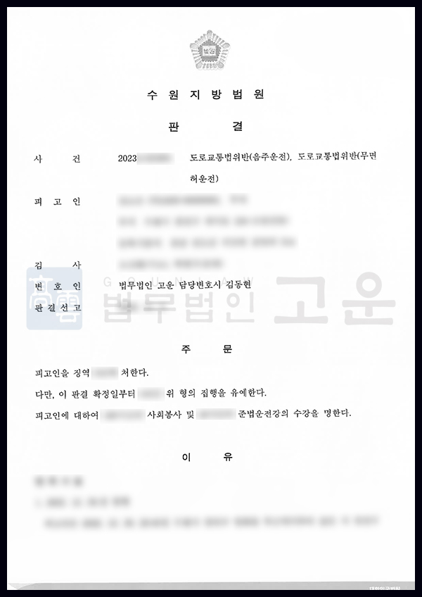 나. 법무법인 고운은 A가 본인의 잘못을 인정하고 깊이 반성하고 있다는 점과, 다행히도 A의 음주운전으로 인적·물적 피해가 발생하지 않은 점, A에게 음주운전 전력은 있으나 자격정지 이상의 전과는 없는 점, A의 자녀가 아직 부모님의 지원이 필요한 어린 나이라는 점, A가 음주운전 재발 방지를 위해 적극적으로 노력하고 있는 점 등 A의 감형에 유리하게 작용할 점을 재판부에 적극 주장하였습니다