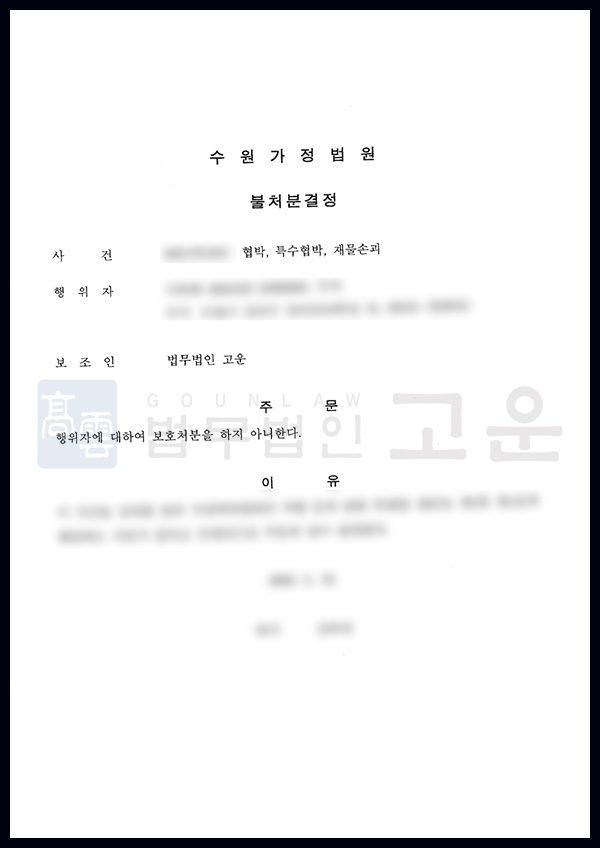 재판부는 법무법인 고운의 주장 및 피해자와 합의에 이른 사실을 고려하여 A에게 불처분 결정을 내렸습니다. 처벌과 처분을 모두 피하고 반성할 기회를 얻게 된 결과에 대하여 A는 매우 만족했습니다.