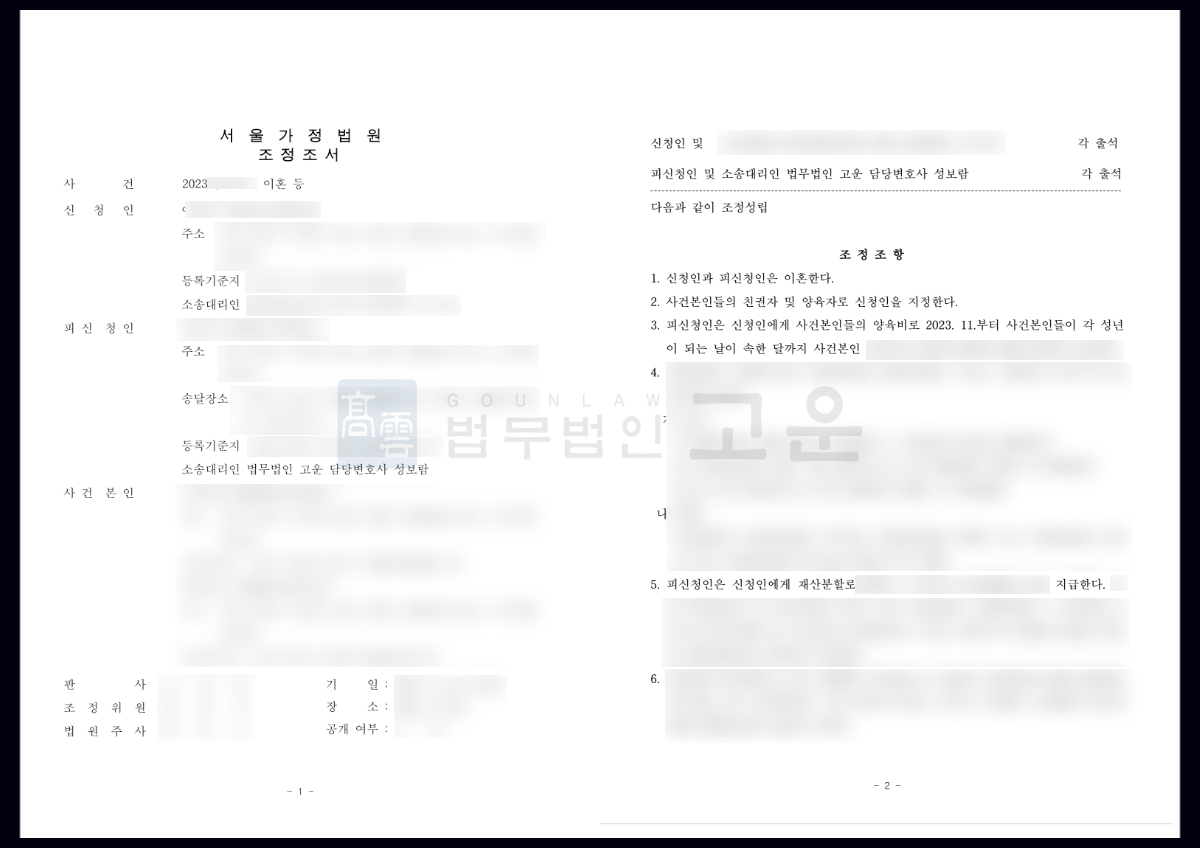결국 조정을 통해 B씨가 청구한 부정행위 위자료는 인정되지 않았으며, B씨가 당초 요구했던 재산분할금의 60%와 양육비의 30%를 감액하는 결과를 얻게 되었습니다.