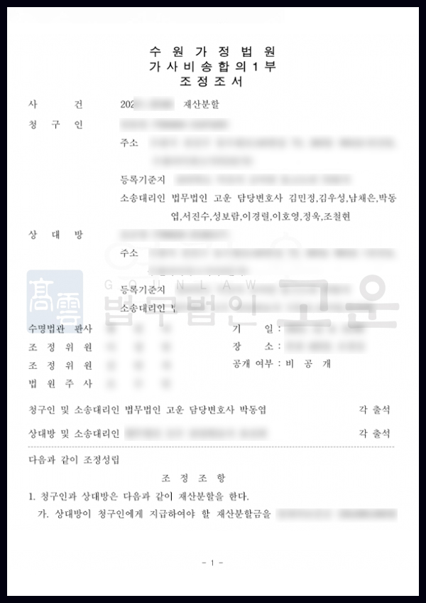 결국 조정에 의해 고운의 주장이 받아들여져 의뢰인은 50%의 재산분할을 받게 되었습니다. B씨가 재산분할을 피하기 위해 부동산을 처분하려 하는 등 어려움이 있었지만, 고운의 조력으로 인해 기여도를 인정받고 원하는 방식으로 재산분할을 받게 된 의뢰인은 결과에 크게 만족하였습니다.