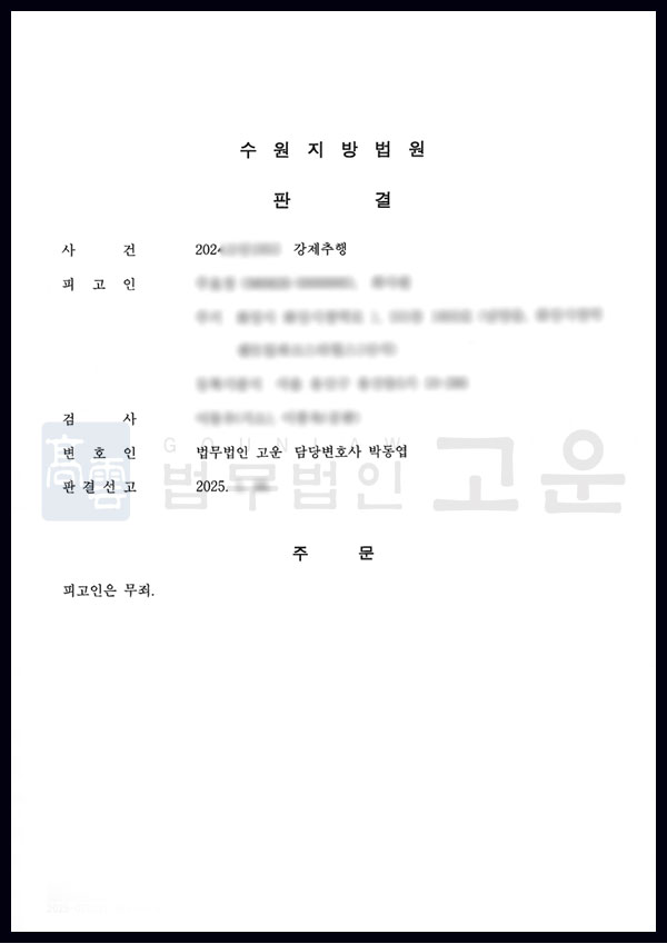 성범죄 사건은 첫 조사 때부터 일관되게 진술을 하는 것이 중요하며, 무죄를 주장하는 사건의 경우 사건 전후의 상활을 증명할 수 있는 객관적인 증거가 무엇보다 중요합니다. 고운은 수사단계에서부터 A를 변호하면서 재판 진행까지 진행될 수도 있다는 점을 염두해 두었고, 시간이 오래 걸리기는 했으나, 결국 A의 ‘무죄선고’로 사건을 마무리하게 되었습니다.