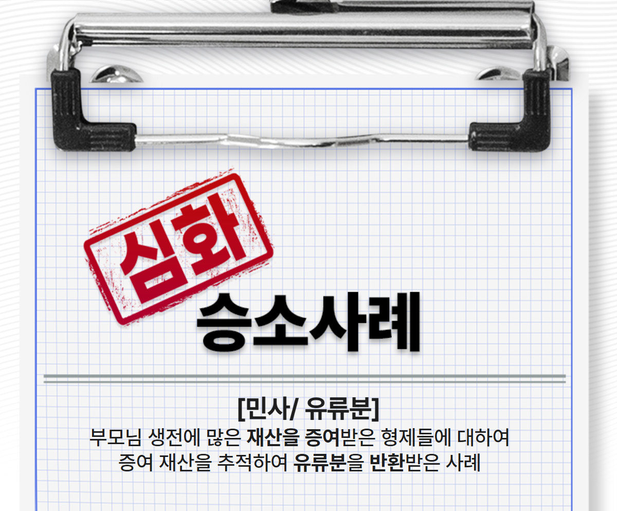특히 의뢰인들은 상대방들이 부모님의 계좌를 임의로 관리하며 많은 현금을 인출하여 상대방들 본인과 다른 가족들 명의로 돌려 증여받은 재산을 밝혀 유류분 산정에 반영하였기 때문에, 그 동안의 고통을 좋은 결과로나마 해소할 수 있었다며 큰 감사의 뜻을 전했습니다.