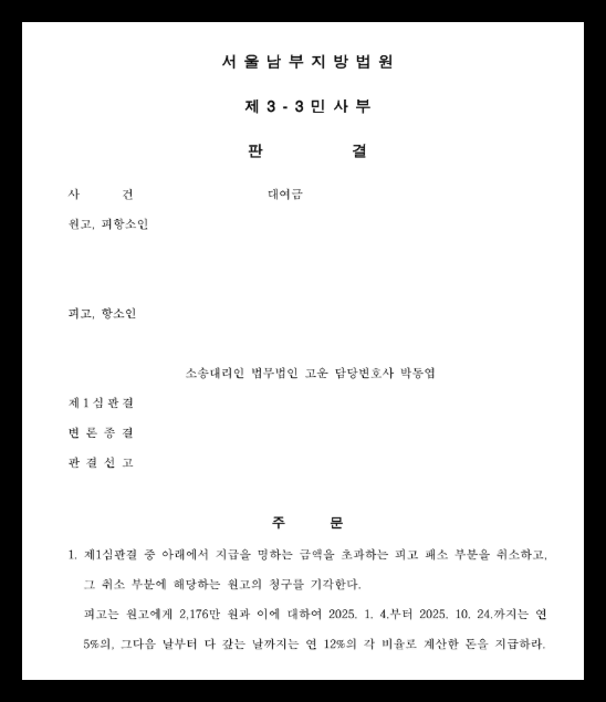 항소심 법원은 법무법인 고운이 제기한 추완항소를 받아들여 본안 판단을 진행하였고, 1심 판결 중 의뢰인 A에게 불리한 부분을 취소한 뒤 상대방의 9,000만 원대 대여금 청구 중 약 7,000만 원을 방어하였습니다. 또한 소송비용에 관하여도 원고에게 더 큰 부담을 지우는 판결을 선고하였습니다.