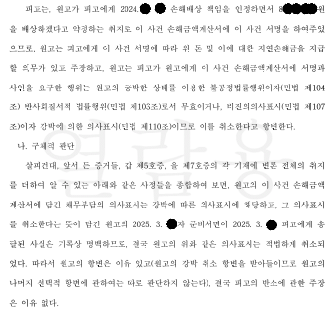 특히 본 사건의 경우 실제 사고를 일으킨 의뢰인이 스스로 손해배상약정서를 읽고 서명한 것이라, 이것이 공포심과 압박에 못이겨 서명한 것이라는 것을 입증하기 쉽지 않아 보였습니다.