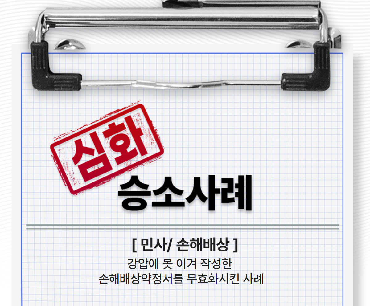 결국 법원은 사장과 의뢰인의 수직적 관계, 회사의 위계적이고 고압적인 분위기, 의뢰인이 당시 생계의 압박으로 사장의 요구를 거절하기 어려운 위치에 있었던 점을 고려하여 의뢰인이 자필로 작성한 처분문서인 손해배상약정서는 강박에 의한 의사표시에 해당하므로 취소가능하다고 판단하였습니다. 이로서 의뢰인은 사실확인도 없이 강압적인 분위기에 못이겨 서명했던 8,000만원 상당의 손해배상 책임에서 벗나게 되었습니다.