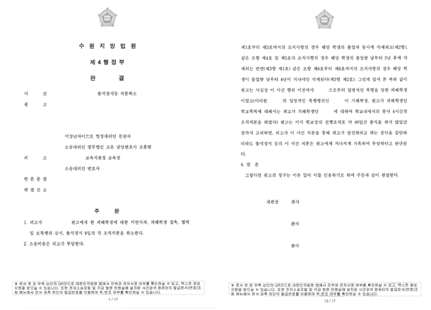 라. 고운 소년학폭전담팀은 행정소송 과정에서 소장, 준비서면, 참고서면 등을 적극적으로 제출하였고, 변론과정에서도 A의 청구가 인용될 수 있도록 재판부를 설득하였습니다. 그 결과 사건 재판부는 고운의 주장 중 재량권 일탈 남용 주장을 받아들여 다음과 같은 판결을 내렸습니다.