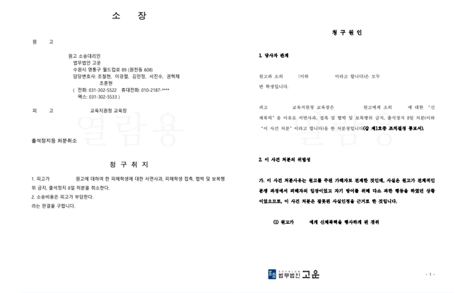 나. 고운은 확보한 자료와 정보공개청구를 통해 확보한 회의록을 통해 위원들이 어떤 부분을 근거로 A에 대해 중한 처분을 하였는지를 확인하면서 A의 행위는 방어적 행위였으며, B가 커터칼을 빼앗는 과정에서 스스로 상해를 입었으므로, 학교폭력 사안 자체가 존재하지 않는다는 주장과 함께, 설사 학교폭력으로 볼 수 있다고 하더라도 이 사건 경위와 학교폭력의 정도를 본다면 재량권의 일탈 및 남용에 해당한다는 주장을 하였습니다.