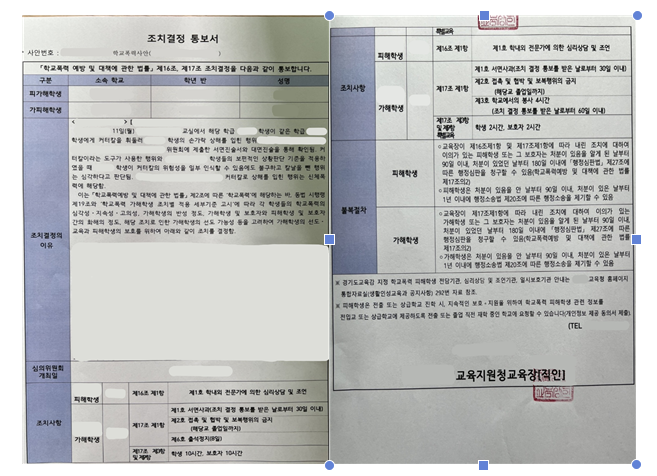 B와 B의 부모님은 이에 대해 A가 흉기를 사용하여 상해를 입혔다고 주장하며, 특수상해 등을 이유로 학교폭력 신고를 하였습니다. 그리고 A와 A의 부모님은 교육지원청에서 진행된 학폭위에 출석하여, A가 폭행을 당하는 과정에서 방어차원으로 커터칼을 휘두른 것이라고 진술했습니다. 하지만 학폭위는 해당 사실을 반영하지 않은 채 A에 대해 1호(서면사과), 2호(피해학생에 대한 접촉 금지), 6호(출석정지) 등 처분을 내렸습니다.