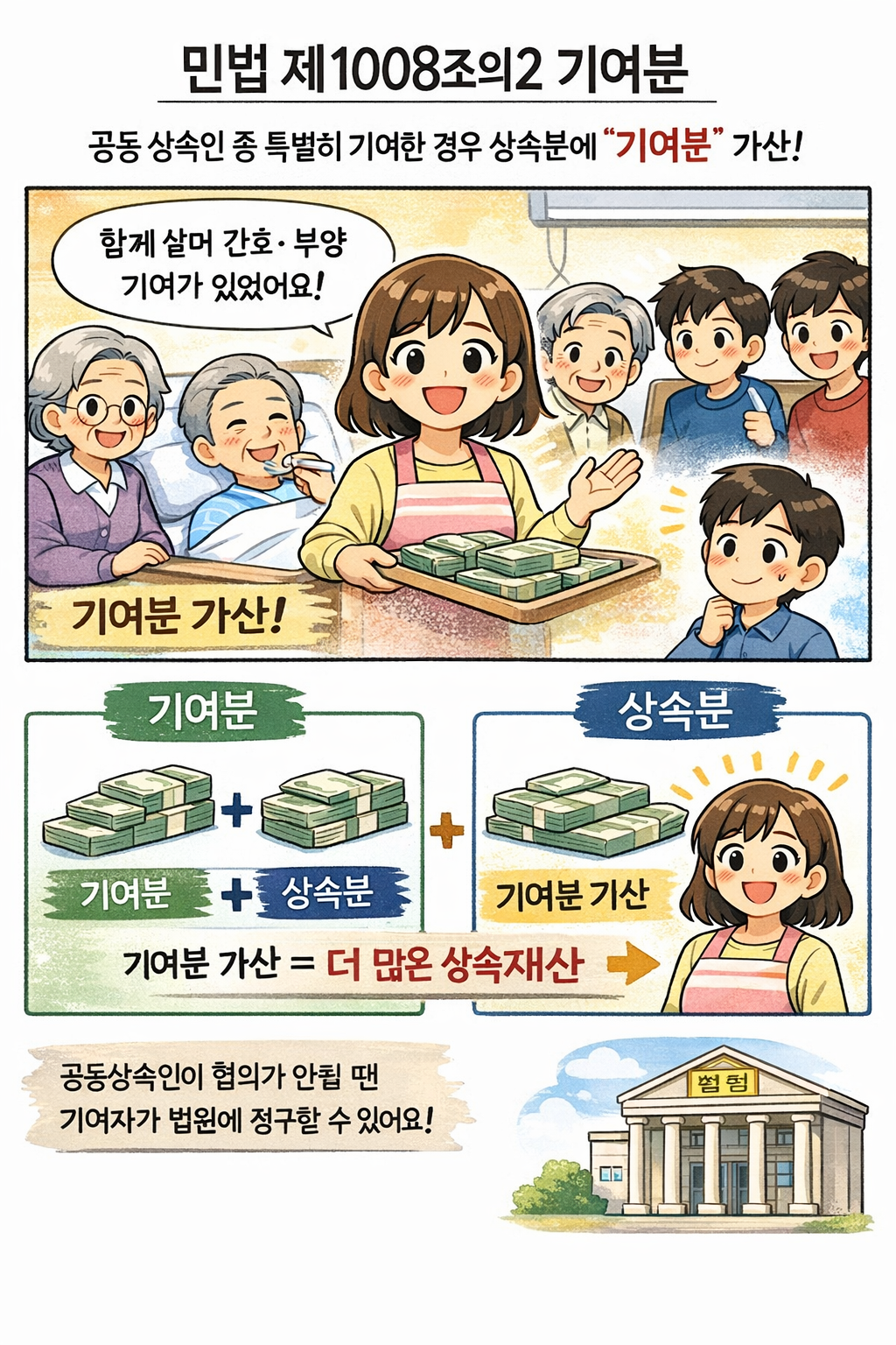 예를 들어 단순히 자식이 부모를 부양하거나, 용돈을 드리는 정도만으로는 기여분이 인정되지 않고, ‘특별히 부양’하였거나, ‘망인의 재산 증가에 특별히 기여’하는 정도가 입증되어야 합니다.
